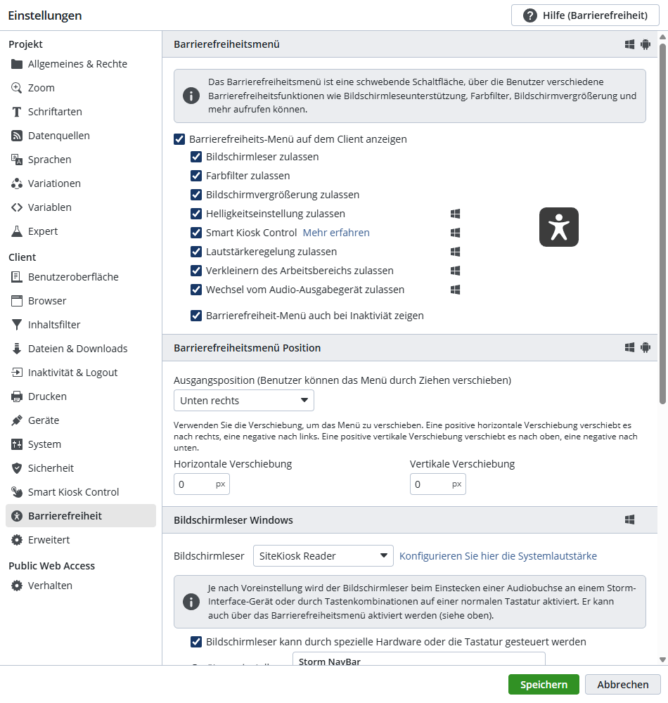 - Für Windows kann neben dem integrierten SiteKiosk Reader auch ein externer Screenreader wie NVDA, JAWS oder der Windows Narrator verwendet werden.