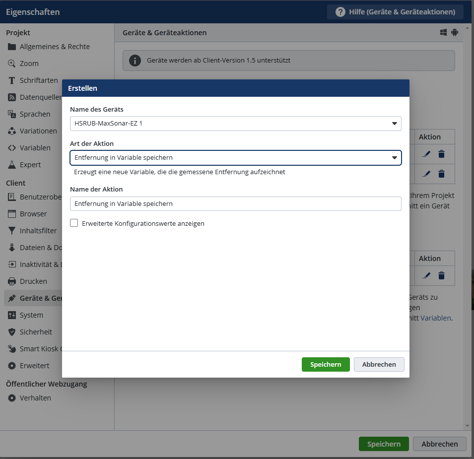 In Projekten, in denen die Abstandsmessung als Auslöser für eine Aktion (Das Anzeigen eines Elementes) verwendet werden soll, müssen die folgenden Einstellungen getroffen werden: