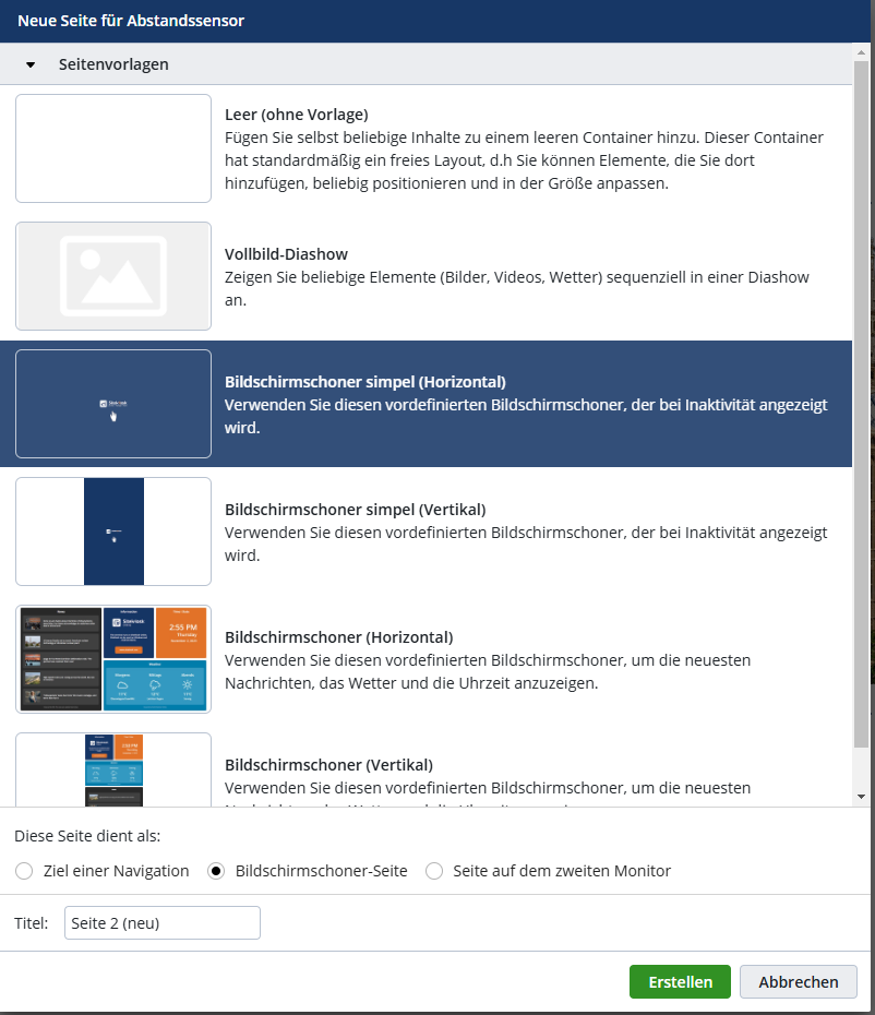 - In diesem Beispiel wurde die Vorlage „Bildschirmschoner simpel (Horizontal)“ ausgewählt. Achten Sie darauf, dass in der Auswahlzeile „Diese Seite dient als:“ die Option „Bildschirmschoner-Seite“ ausgewählt ist. Elemente können ebenfalls als Bildschirmschoner verwendet werden, hierfür muss am gewünschten Element die Anzeigebedingung manuell angepasst werden (Bildschirmschoner (Benutzer inaktiv) für alle Seiten und Elemente)