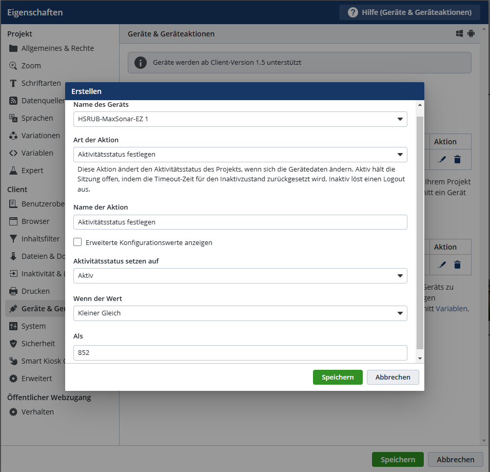 - Tragen Sie in das rechte Kästchen den gewünschten Abstandswert ein, der unterschritten werden muss, damit der Sensor die gesetzte Aktion auslöst und das Projekt-Element auf dem Terminal angezeigt wird. Wird hier bspw. 850 eingetragen, wir die Aktion ausgelöst, sobald sich eine Person näher als 850 mm vor dem Sensor befindet.