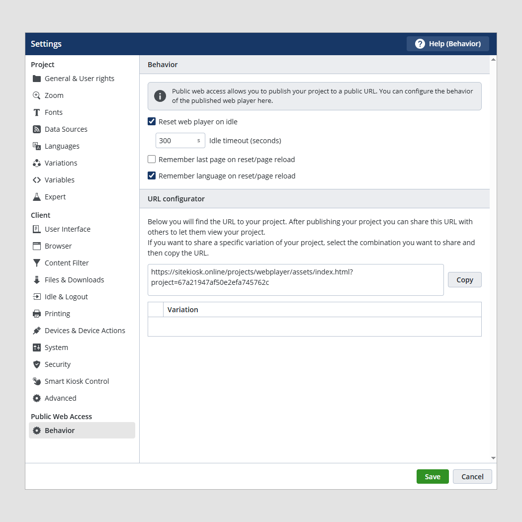 The SiteKiosk Public Web Access (PWA) Service enables the use of published SiteKiosk Online projects with limited functionality on any device, such as PCs, smartphones, or tablets. Users can access the project via a URL in any standard browser.
