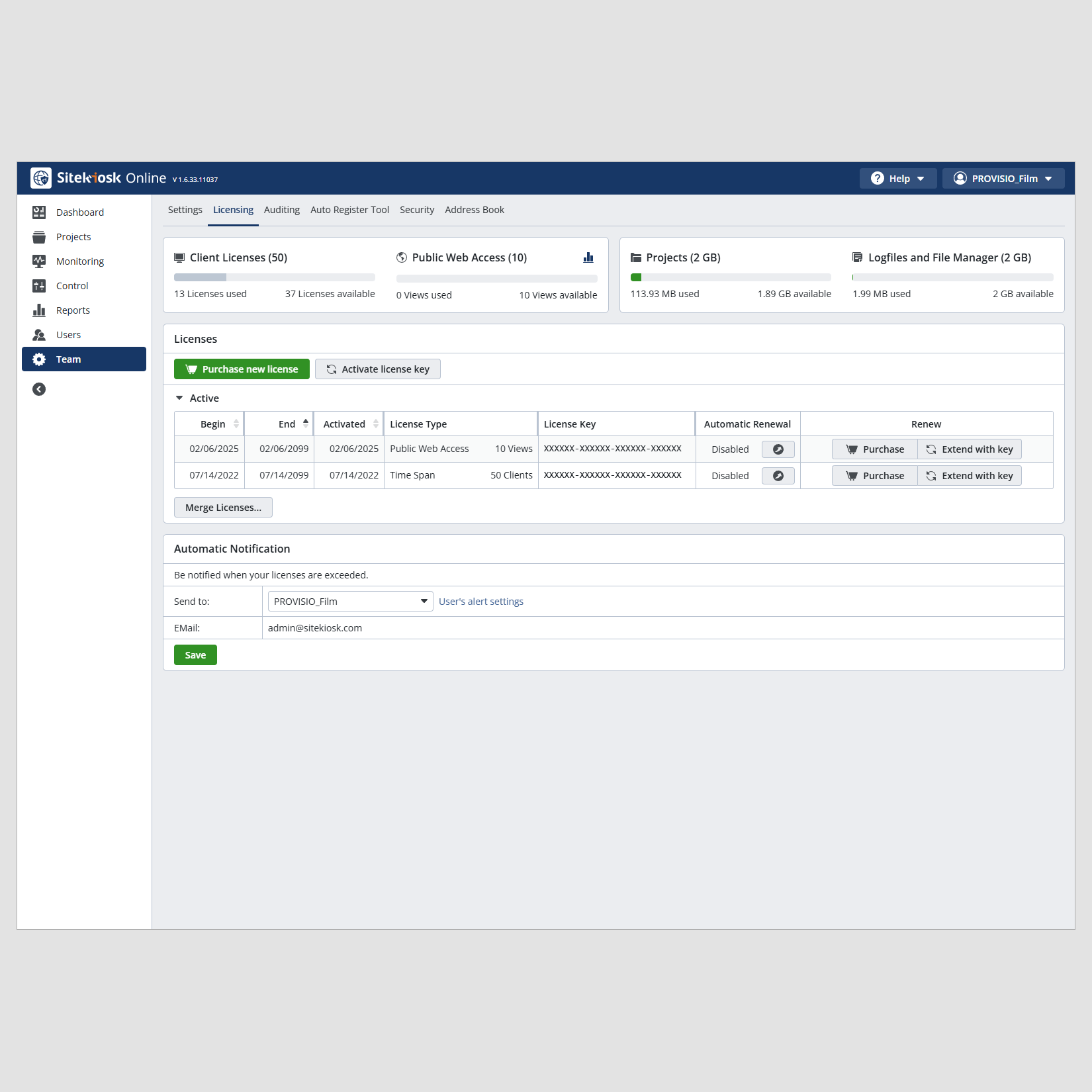 Each Public Web Access (PWA) license allows up to ten simultaneous users to access various SiteKiosk Online projects within a team, with a 12-month license duration. When a user opens a licensed PWA URL, it counts as an active access.